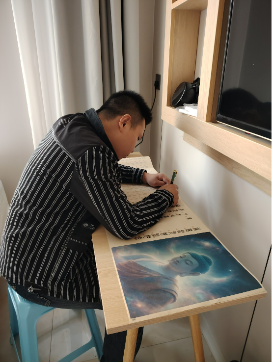 小兄弟来待了一个月后就去了师兄处,我笑言他真是有福报,楼下多少年都在两个公交站点中间,结果外地师兄来的那天我送他时,赫然发现楼下突然开通了一个新站点,这样去坐高铁时,一站到底就可以了,真是一路顺风神助。小兄弟带着各种法宝,一篇他抄写的篆体《心经》,还有特地送他的一尊琉璃药师佛去了师兄处,计划待到年前再回家。