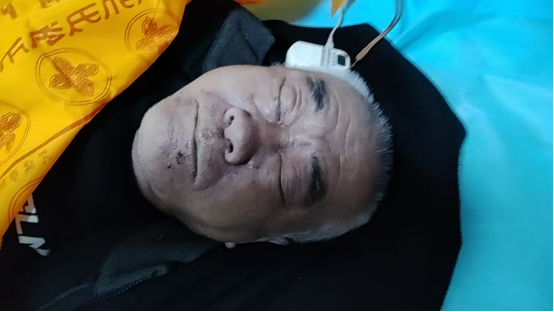 我老伴儿刘某,77岁,长期耳濡目染,被动听法。有心脏病、高血压、肺病、糖尿病史,近期心衰症状明显加重。11月16号小心翼翼地登上大巴车,从山东威海海边(每年夏天开始在这儿住七个月)回沧州老家,中途突然猝死离世。约二十分钟后,开始听老师亲诵的《引导文》,除换车搬动不可避免,没做任何处理,放入卧室播放《梦》,一直持续听《引导文》满48小时,擦洗换衣服时,肢体柔软,面色始终安详自然。
