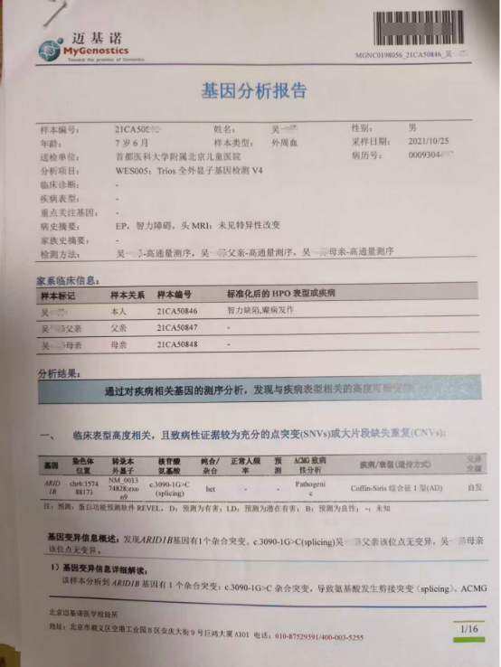 但是我得为了孩子,振作坚强,我不能倒下,我不能放弃,继续去儿童医院检查。这次查的基因检测,结果是基因突变,世界难题。当时我和孩子爸爸抱头痛哭。医生说没别的办法,就是吃药控制。