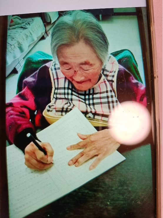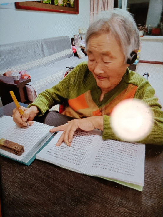 上个月有一天,我与姐姐饭后聊天,谈话时姐因某事生气,语气愤怒,表情激动。因平日母亲从不关注我们说话,自己只专注抄法或看法,很少有情绪表现和意愿要求,我们聊天也不顾及她的。正聊着,只见妈把她正看的法本往姐眼前推了又推,姐很惊讶地问妈:“妈妈你干嘛呀?是让我看吗?”妈点头,指着心咒“神是爱,上主是爱,我是爱”几个字说:“你念!”姐欢欣地说:“妈,这是真学明白了呀,妈放心,你的话我一定会听,我回去明天就念……”姐走后,我抱着妈,贴着妈的脸,激动地赞叹她:“妈,你真棒啊,你会弘法啦,好厉害呀,我要向你学习呀!”