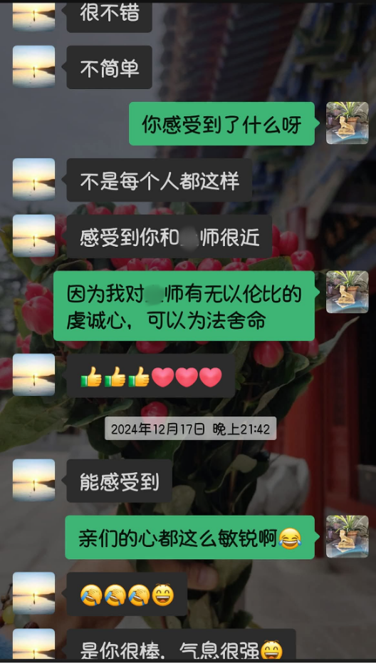 2月15日上午收到师兄发来的《新年寄语》,老师的拳拳爱心、祝福法语、慈悲鼓励、以身示范……被老师光明温暖的佛力穿透,我的泪水夺眶而出: