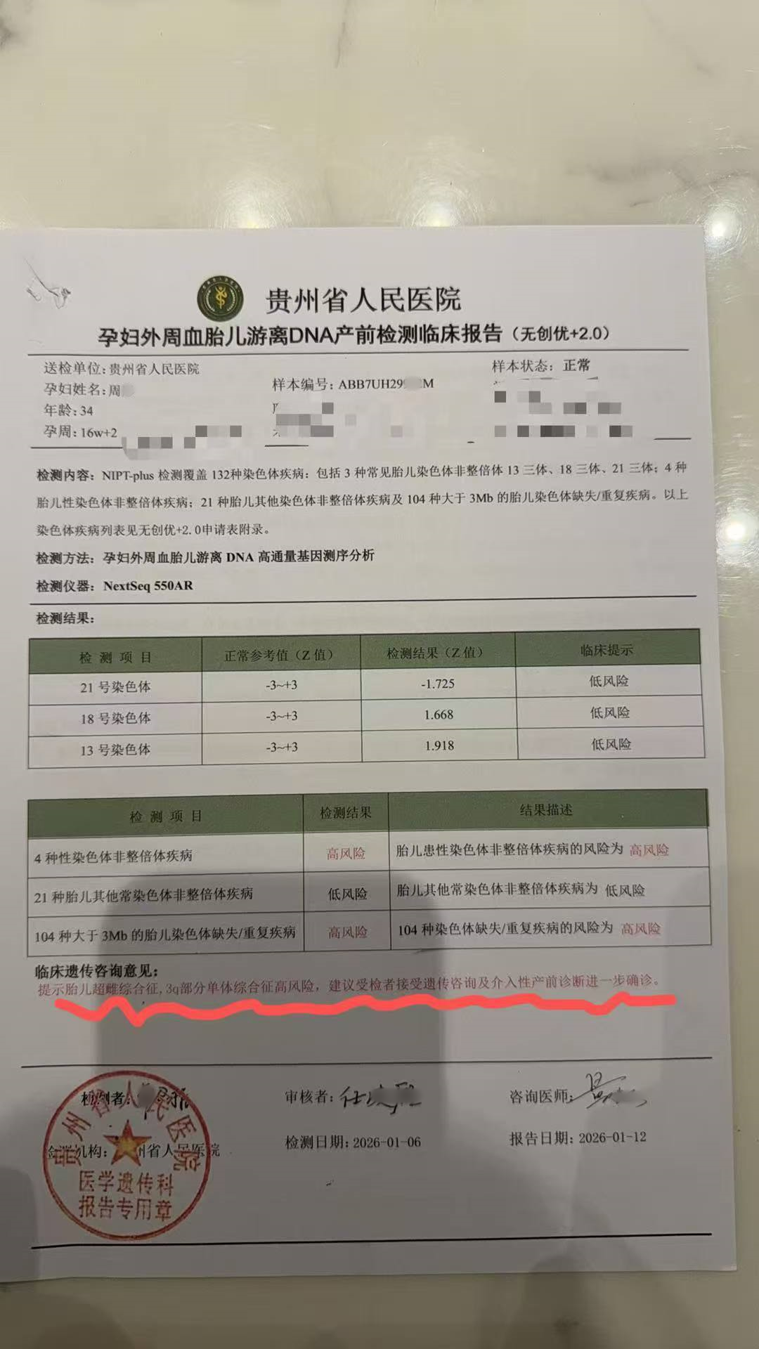 得到了新生命的我们一家,对这个新生命的到来充满了期许。就在我们满心欢喜做着一切现代医学检查,并没有觉得有什么问题的时候,一个考验降临了:孕16—20周的无创DNA检测结果,小家伙的基因有问题,结果显示小家伙患性染色体非成倍疾病的风险为高,104种染色体缺失或者重复疾病的风险为高。医生解读这个有问题的报告,建议做进一步的检查,如果确诊,这个宝宝是不能要的。听到结果的那一刻我是强装冷静的,可是这个生命已经在我身体里4个月了,冷静接受结果之后换来的是崩溃的本能情绪……强压下情绪跟家人商量后,我们决定接受进一步的检查“羊水穿刺”。