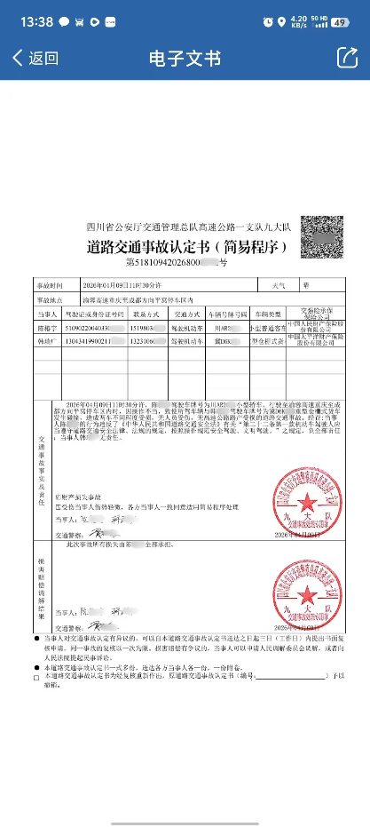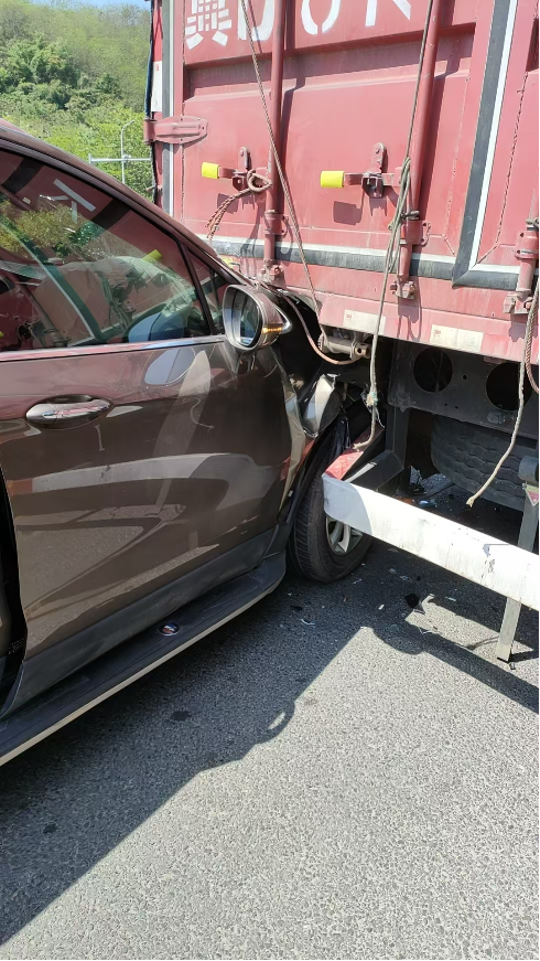 2026年4月9日中午,女儿驾车行驶在渝蓉高速,在简阳路段进入平窝服务区时,由于操作不当,在服务区道路上发生了交通追尾事故,以约90迈的车速,追尾碰撞上停在路边的箱式大货车。