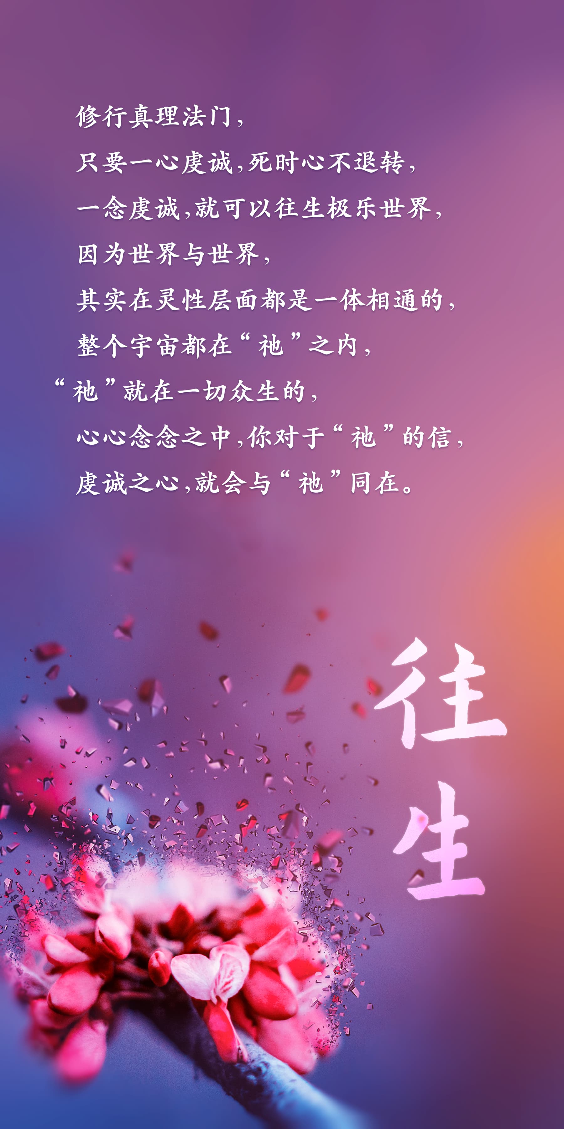 其实宇宙众生,从未与“祂”分离,我们时时刻刻都与“祂”同在,都与“祂”同体,只是被我们心意中的自我,隔绝了与“祂”慈悲智慧的相通;若我们一心一意信仰“祂”,渴望“祂”,就可以借助“祂”智慧展现在人间的真理道路,回归“祂”清净无生的平安慈悲,“祂”的慈悲在众生信仰心之中呈现,就是极乐世界,众生的心意自我,借助信仰回归到“祂”慈悲呈现的世界中,就是传说中的“下品下生”。