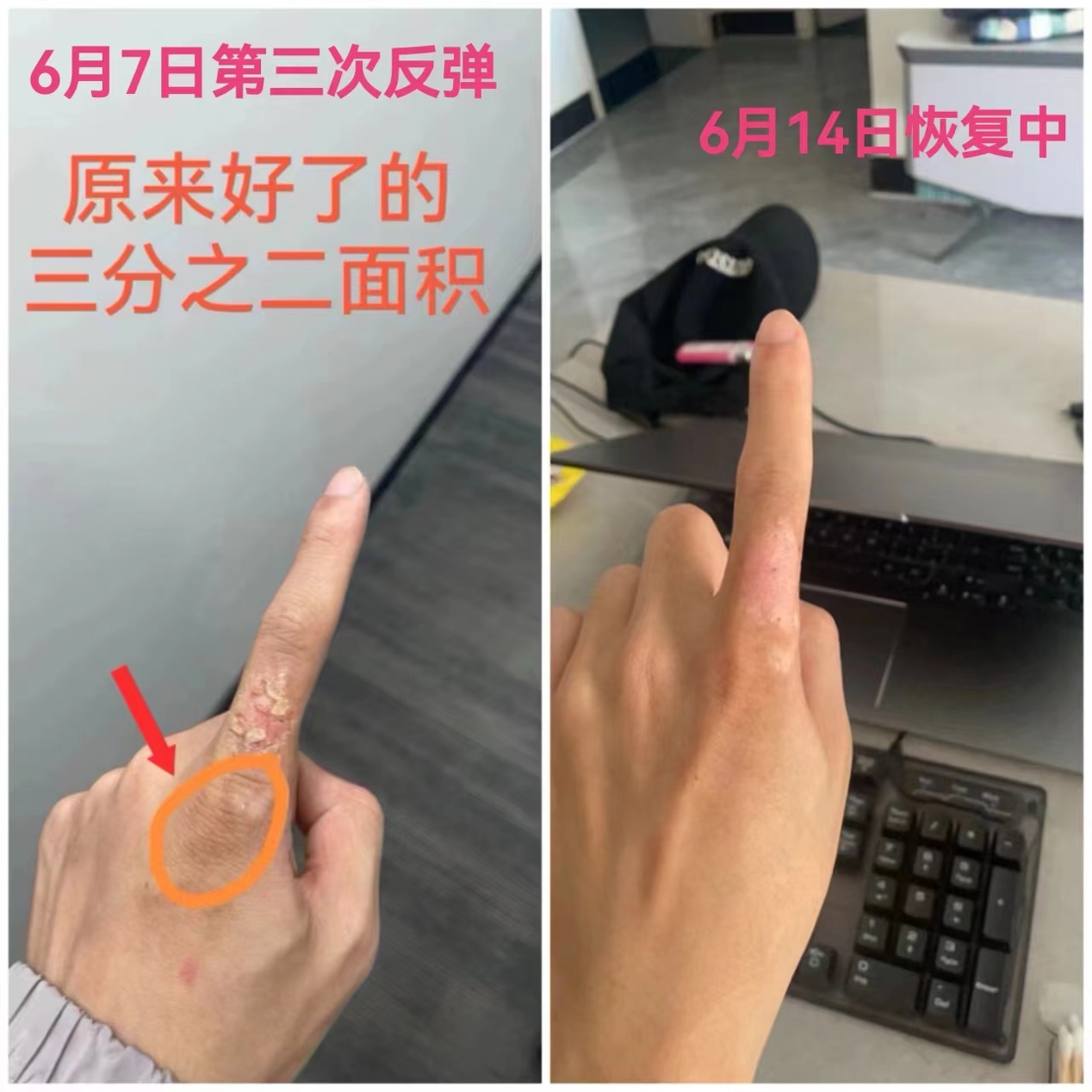 另外一个案例,是我儿子左手食指上的皮肤。原来刚刚开始有一指长、2—3公分宽的皮肤一直是烂的,而且很厚,无论涂什么药都不好,总是见他痒了就抓,抓多了就抓烂了。后来我用这个方法后,第一次效果好到惊人,才几天的时间,原来一指长的烂皮肤就几乎全好了。但是这个业力比较深,没过多久,深层的业力浮现出来,虽然看着是反弹了,但发出来只有原来1/3的面积了,另外2/3面积全部好得恢复了正常皮肤的样子。第二次也是用这种方法,几天后,我儿子在外地,给我看他手指的视频,他说:“奇怪,这手会自己好?”我说:“什么呀,要不是老师,你会好得这么快才怪!”可是,这一小块皮肤很顽固,没过几天,它第三次又开始反弹,更深层的业力又再次浮现。通过和儿子视频观察到这种情况后,我坚持不懈地继续加油用这个方法,观想我儿子是老师的显现,看到儿子手指皮肤溃烂的焦虑的自己也是老师的显现,观想老师的模样,用老师的眼光宽恕这一切,接纳这一切,爱这一切。也是才几天的时间,在儿子没有涂任何药的情况下,那块皮肤看着又开始好了。(附:几张儿子手指皮肤愈合前后对比的图片。可惜最初原发的全部烂皮肤没有留下照片)。
