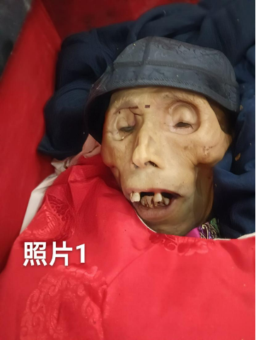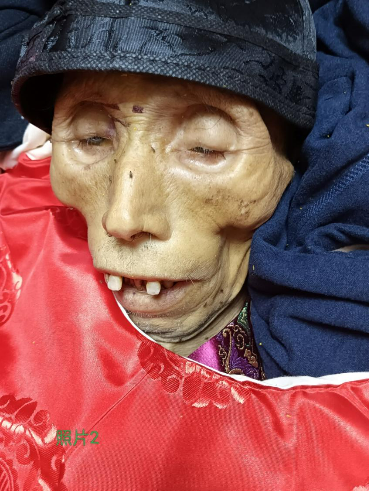 2025年9月19日晚8点,我得知该老人去世的消息后,就带上播放机立马赶去现场,与亡人儿子沟通为老人播放恩师《引导文》事宜。经他同意后就开始为亡人播放老师亲诵《引导文》(这时候亡人已过世30小时)。接着我就去掀开棺盖准备拍亡人照片。当我揭开盖在亡人脸上的盖纸时,看到有无数小飞虫爬满亡人的眼睛、耳朵、鼻子、嘴巴处,受惊吓的小飞虫四散而逃,有些还直撞到我拍照的手上、胳膊上和脸上……。当时亡人的表情看上去很痛苦很恐惧,面色已发紫(见照片1)。