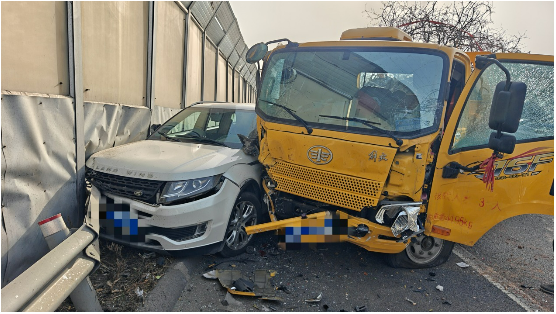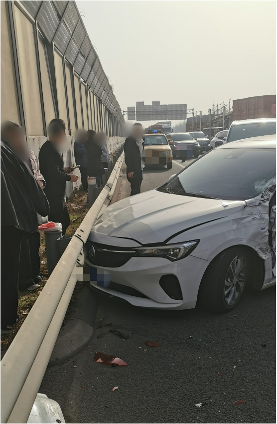 再往后走,才看到还有两辆车也被撞了(见图3),受牵连的一共是五辆车,现场大家都平安。下午到家后,听说第三张图片中那辆小车的司机和货车司机住院了,不过预计三天后就可以出院,问题不大。