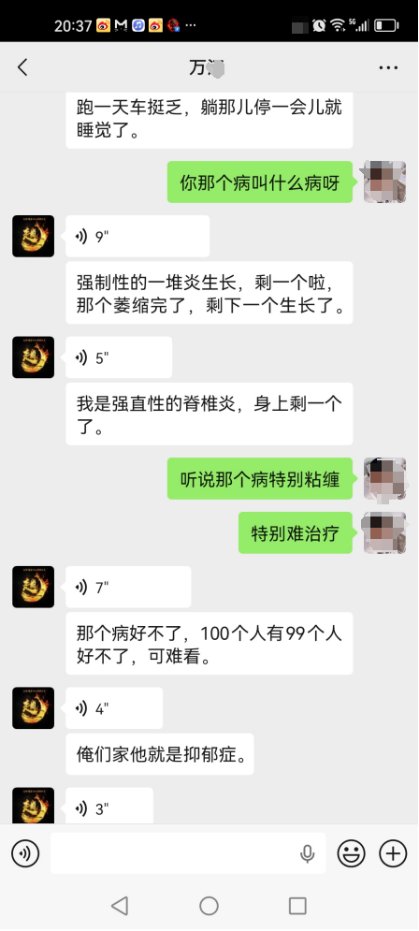 去年,我把孩子学校给的那个贫困补助费捐给了一个得了重病的司机大哥,我给这个大哥弘过恩师法,送过他恩师录音播放器。这个大哥得的是强直性脊柱炎,肾脏就剩下一个了,还有一个肾脏萎缩得也快没了!并且这个病特别难治疗,粘缠得很,司机大哥说100个人里99个都好不了!