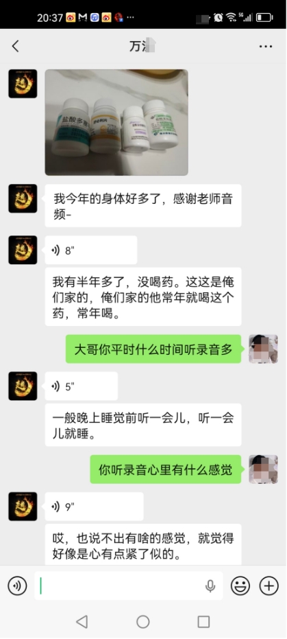 今天和大哥聊了他现在的情况,从我送他录音播放器,到现在半年来不吃药了!恩师的神迹,这种直接超度,起死回生开始频频发生!原本想让大哥把医院诊断证明发给我,但是因为搬家原因不知整哪里了!我上传了几张和大哥微信聊天记录,与师兄们分享。因为这个人是我亲自弘法的,我知道一个神迹对于灵魂的帮助有多大,所以及时上传上来,神直接对灵魂的救赎!