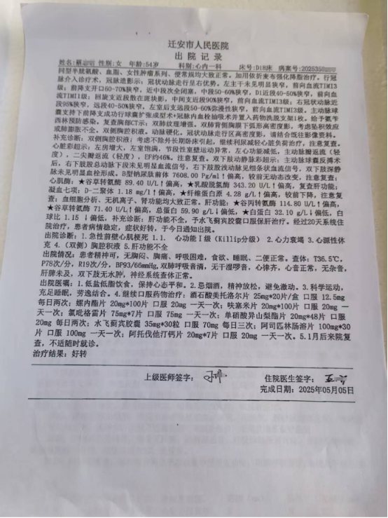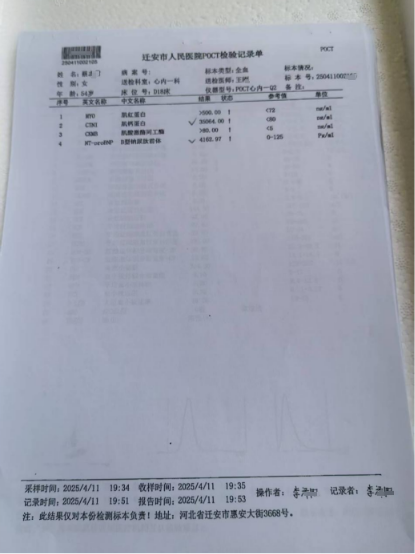 2025年4月11日凌晨三点多,我媳妇突然说后背疼、胸口闷,脸色煞白。起初我以为是累着了,没有意识到如此严重。直到下午五点,病情越来越严重。我们很快去了较近的燕山医院。检查结果是三条主动脉堵塞达90%以上,因病情过重,医生让我们马上转院。