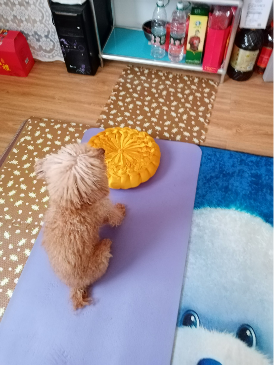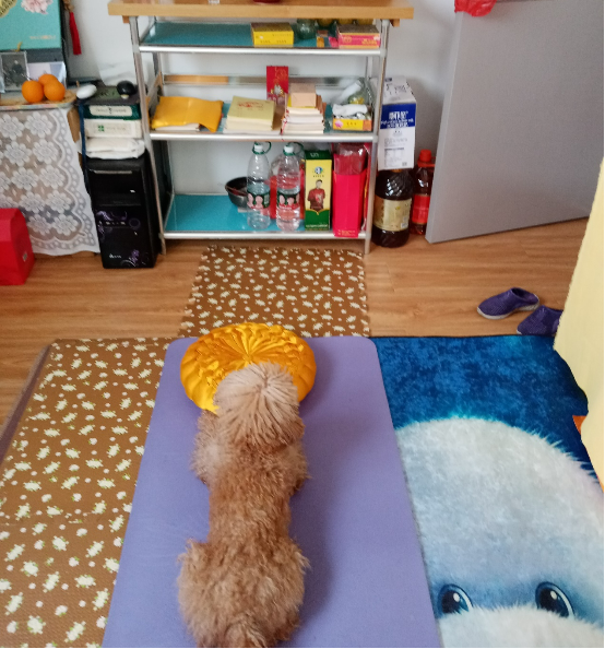 每天做早课时,QQ狗会自己做着很标准的姿势,虔诚膜拜佛菩萨与老师(见图),还与我同看老师视频,我还为QQ狗皈依老师了,还经常会拿老师吊坠法相给QQ狗看,一边对QQ狗说:QQ,这是老师,你要将老师法相铭刻在心坎,你要认真听老师法,将全身心交付给老师看护。QQ狗露出笑脸与感激的眼神,高高兴兴接纳。