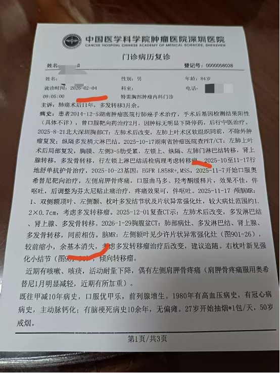 姑父患肺癌十多年了,癌症初期做了手术。2025年10月17号,在湖南省肿瘤医院检查,肺癌晚期复发扩散全身及脑部都是癌细胞,并发新的癌症,医院建议回家,不需要任何治疗了。11月初,姑父从湖南回到了深圳。
